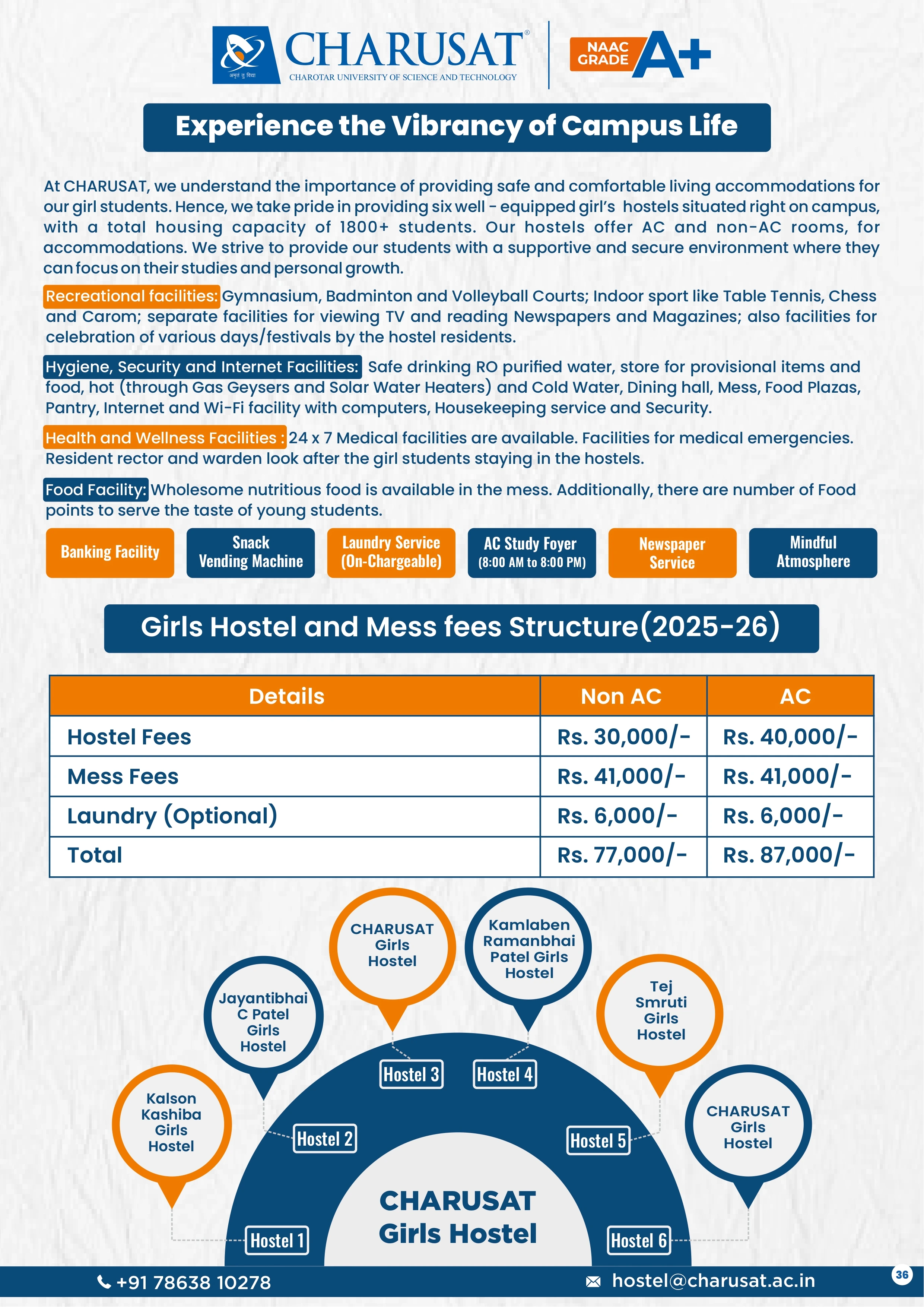 Facilities available at these hostels include Dining hall, Sports, reading room, TV room, Wi-Fi connectivity and transport facilities to the campus and back. Guest rooms are also available.