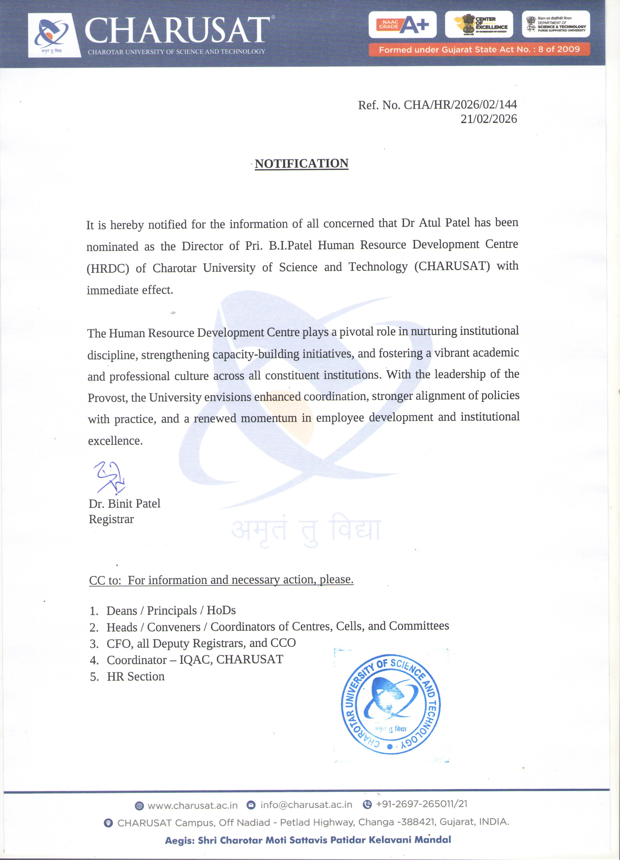 NotificationsCHARUSATUGCAICTECHARUSAT NotificationsWaste Management Committee NotificationNewMarch 05, 2026Notification of nomination of Dr. Atul Patel as Director, HRDCFebruary 21, 2026CHARUSAT Chronicles: The Quill - Latest Issue (March-April 2025)April 05, 2025UGC NotificationsPrecaution to be taken by the students before enrolling in Programmes offered under Open & Distance Learning (ODL) and/or Online Learning (OL) modeMarch 19, 2024CHARUSAT UGC ApprovalAICTE NotificationsNo AICTE notifications at this time.