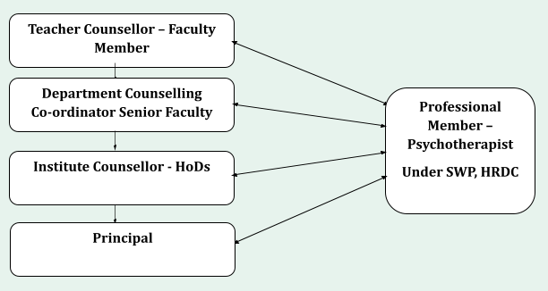 - Considering the number of students referred by the Teacher Counsellors, additional Department Counselling Co-ordinators may be assigned by the Institute Counsellor.